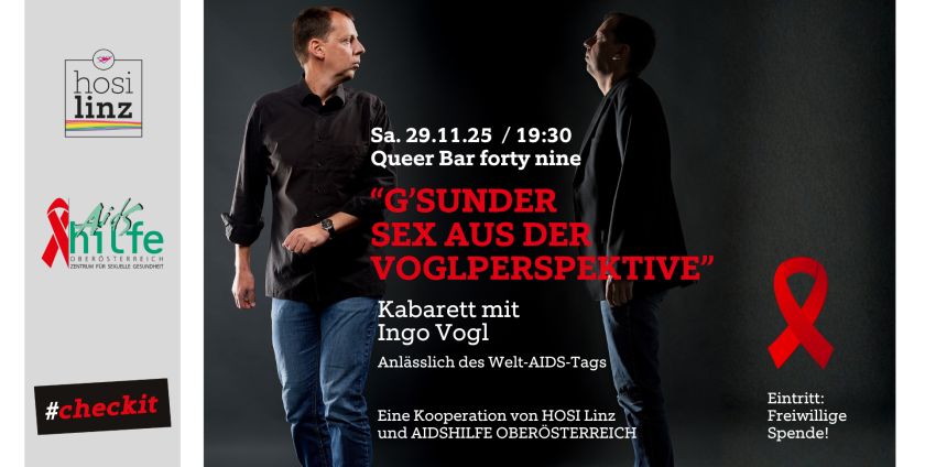 Anlässlich des Welt-Aids-Tages geht am Samstag, 29.11.2025, von 19.30 – 20.30 Uhr der Kabarettabend „G’sunder Sex aus der Voglperspektive“ mit Ingo Vogl in der Queer Bar forty nine über die Bühne.